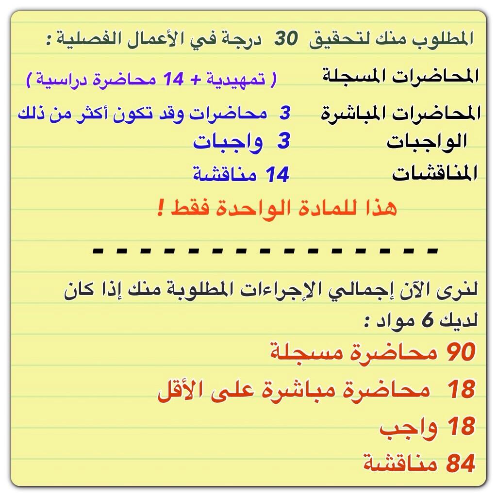 السلام عليكم .. لوسمحتو عندي اكثر من سؤال ؟؟؟ 1- كيف يتم احتساب درجة المشاركة ؟ 2- كيف يتم احتساب درجة المحاضرات المسجلة ؟ 3- كيف يتم احتساب درجة حل الواجب ؟ وهل اذا كانت الاجابة غير صحيحه يتم احتساب المشاركة ام لا؟ ((( يعني اذا شاركت سواء كانت الاجابة صحيحة او غير صحيحة يتم احتساب الدرجة لي ))) 4- كيف يتم احتساب درجة المحاضرات المباشرة ؟ 5- ماهي الطريقة الافضل لمذاكرة وحل الواجبات ؟ اسف علي الاطاله ولاكن طالب مستجد ومنكم نستفيد ولكم مني جزيل الشكر |