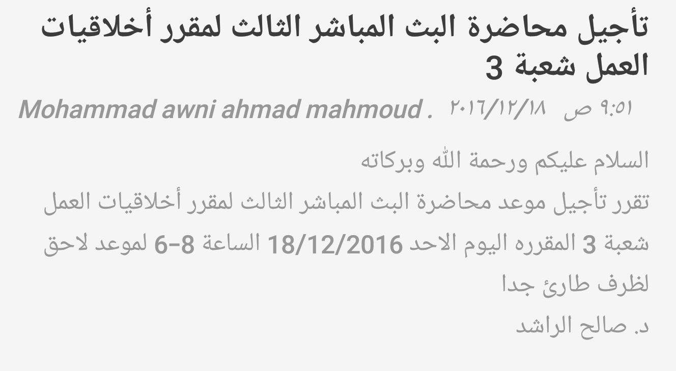 رد: تم تأجيل البث المباشر ٣ "مقرر أخلاقيات العمل"