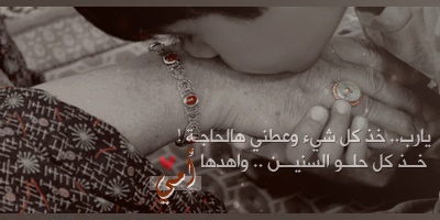 يمه ترى راحتي في بوسة اقدامكِ أقدامكِ اللي على الجنه توديني يمه عسى الله يطولها لي أيامكِ حسكِ معي دوم يسندني ويحميني ياليتني عنكِ أشيل ال آه وآلامكِ ياما تحملتي أوجاعي وشلتيني عسى الفرح دوم من خلفكِ وقدامكِ ياساكنه في وسط قلبي وفي عيني . |