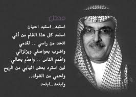 واعذريني يا تفاصيل الغياب ولوحة التذكار ................ وَ صمت الهمّ في ضلع الحنين وصورة عتابه قَسم ما فاض بي هم الرحيل ومقفر الأشجار ................. عدا من صوت ترتيل الوتين وجلدة كتابه كِذا صدّ الفرح عني وكذا تمحيني الآثآر ................... كذا لا زانت الضحكه يرد الهم كذّابه |