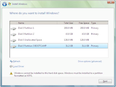 هذا شرح كامل لطريقة تثبيت الوندز ( Microsoft Windows ) علي برنامج البوت كامب ( boot camp ) خطوات التنزيل : تشغيل برنامج البوت كامب ( Boot Camp ) عن طريق البرامج الموجود في التطبيقات / ملحقات تقوم بتقسم الهارد دسك بشرط ان يكون اكثر من 5G يستحسن ان يكون حجم الوندز 32GM اضغط على Partition ثم سيقوم نظام الإعداد بتهيئة الجزء الخاص بنظام ويندوز بعد كذا تبداء تنزيل الماك عن طريق الضغط علي Start Installation راح يقوم بإعادة تشغيل الكمبيوتر و يبداء تنزيل الوندوز ، طبعا طريقة تنزيل الوندز عاديه نفس طريقة التنزيل في الاجهزه الاخرى .. طريقة تثبيت الوندوز ،،، الويندوز سوف يبدأ بتحميل الملفات للتنصيب . تنصيب الوندز سوف يبداء بعد الانتهاء من تحميل الملفات ثم اضغط على INSTALL NOW سوف يبدأ الويندوز يحمل بعض العمليات في هذا القسم وهو قسم تجميع المعلومات سوف تحتاج إلى PRODUCT KEY الذي مكون من 25 رقم وحرف والان نقوم بوضع السيريال في مكانه الان سوف تعين نوع التنصيب الذي لازم ان تفعله وهو اضغط على CUSTOM (ADVANCED : ![]() الخطوة التالية وهي اختيار مكان تنصيب الوندوز بعد اختيار الدرايف الذي تريد تنصيب الويندوز عليه اضغط على الخيار الرابع BOOTCAMP . بعد كذا تضغط علي drive optioins (advanced بعد كذا تضغط علي format فورمات بعد كذا تضغط علي NEXT في هذا القسم يقوم الويندوز بالتنصيب .سوف يأخذ وقت ولا تضغط على أي زر في ، الويندوز الان ينسخ الملفات الان الويندوز يعيد التشغيل. اذا كان هناك وضع آخر اضغط على RESTART NOW الان الويندوز يدخل اول مرة لذلك لا تعبث وكل ما عليك هو الانتظار الان يوجد المزيد من التحديثات والتنصيب للاكتمال سوف يعيد الكمبيوتر التشغيل الان التنصيب تقريباً انتهى ثم اكتب YOUR USERNAME واكتب الباسورد او اتركها فاضيه أحسن واذا كنت تريد واختر الصوره .... اختيار طريقة الحماية الويندوز. انا انصح بالاختيار الاول وهو USE RECOMMENDED SETTINGS اضغط عليه للمتابعة هنا تحتاج لوضع وقت منطقتك الصحيح و ايضاً التاريخ ثم NEXT للمتابعة هذه هي كل المعلومات التي جُمعت التي انت بحاجة اليها الويندوز سوف يشكرك واضغط على START للمتابعة لان الويندوز سوف يدقق اداء حاسوبك بعد دقق اداء الحاسوب سوف begin to load للوندوز ثم يأتي لك بوضع الباسورد الدي اخترته ثم اضغط على السهم للمتابعة لان بعد كتابه الباسورد اضغط على ENTER بعد كذا الوندوز فيستا يرحب بك النهاية ومبرووك لكم الفيستا و بالنسبه لتعاريف الوندز اذا كانت نسختك Leopard Mac OS X 10.5 سوف تجد التعاريف في سيدي الــ Leopard Mac OS X 10.5 فقط تقوم بوضع الــ CD و انزال التعاريف ............................. بعد تنزيل الوندز عند تشغيل الكمبيوتر سوف يبدا الوندز تلقائيا : للإقلاع من أحد النظامين ، أعد تشغيل الجهاز مع الضغط على زر Alt واختر قرص اقلاع الويندوز أو الماك : لجعل الماك هو النظام الرئيسي ولتعديل هذا الخيار استخدم خيار الـ Startup Disk من System Preferences و اختيار الماكنتوش و بعد كذا تسوي اعادة تشغيل للكملبيوتر : |