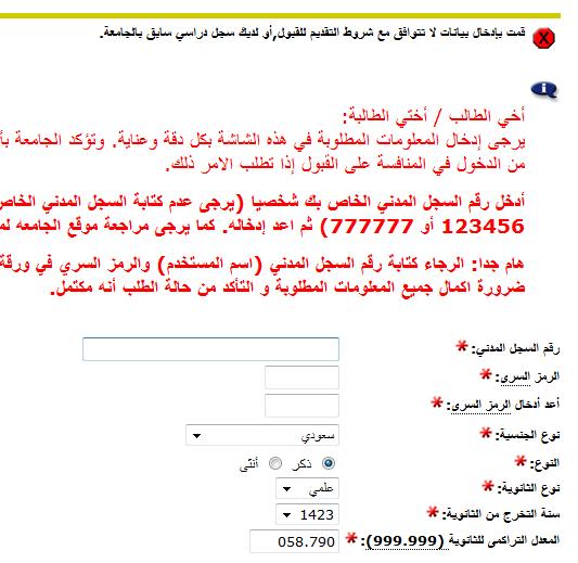 قمت بإدخال بيانات لا تتوافق مع شروط التقديم للقبول,أو لديك سجل دراسي سابق بالجامعة. مع العلم ان المعدل 058.790 وسنة التخرج 1423 مع اني ولامرة سجلت بالجامعه ابد وايش هي الشروط اللي يقول عنها ؟؟؟؟؟؟؟؟؟؟؟؟؟ |