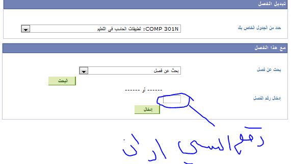 بعدين التسجيل بعدين التسجيل: تبديل الفصول اختاري المادة الي تبين تبدلينه واختاري الحاسب وروحي للمربع الصغير وحط رقم السي ار ان الي الي حطيتهم لك بعدين حطي ادخال وشوفي واحد واحد واختاري الوقت الي يناسب جدولك واذا شفتي الوقت الي يناسبك حطي العنصر التالي بعدين العنصر التالي بعدين انهاء التبديل وبكذا بدلتي الارقام وتاكدي من جدولك ياقلبي شوفي الصورة الي محطوطه بلمرفقات |