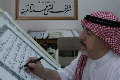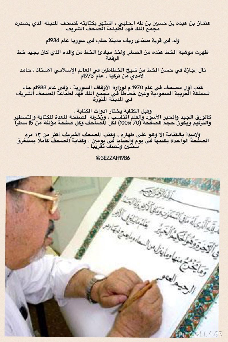صورة و معلومة عثمان طه الحلبي اشتهر بكتابته للمصحف والذي تستغرق كتابته كاملا سنتين ونصف تقريبًا لايبدأ بالكتابة إلا وهو على طهارة ![]()