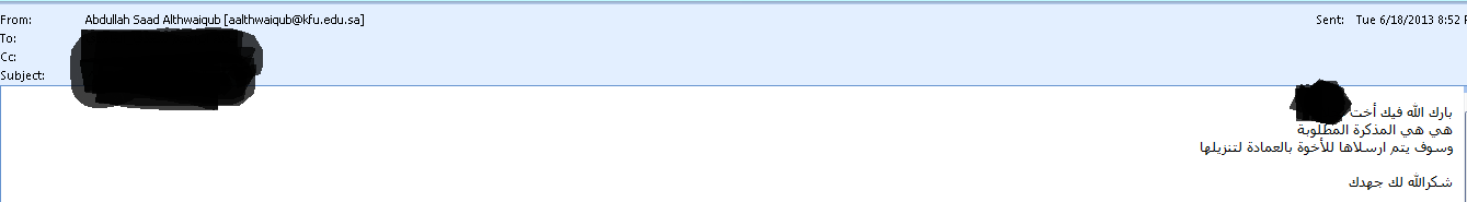 قمت بإرسال المذكرة ذات العشر قضايا للدكتور عبدالله الثويقب للإستفسار وقام بالرد علي بأنها هي المعتمدة بقوله: هي هي المذكرة المطلوبة إمعاناً في التأكيد ![]()