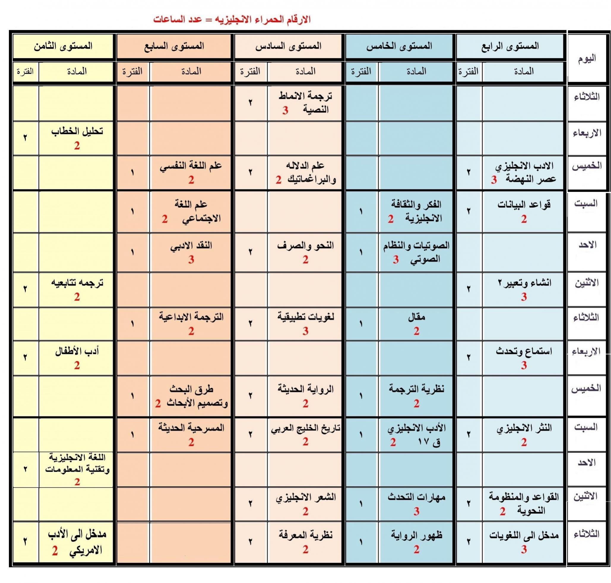مافهمت جدولك اول شي ابي اعرفه انتي خلصتي قضايا ثقافية معاصرة ؟؟؟ والحضارة الاسلامية ؟؟؟ خلصتي هذول المادتين ؟؟؟ وانتي ماخذتي معنا مدخل اللغويات صح ؟؟ عشان يبان معي جدولك صح للمستويات المتقدمه مشان ماتصير لخبطة وضغط مواد ... |
