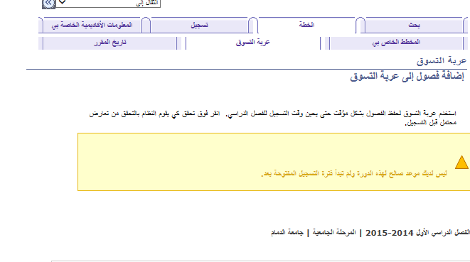 انا جيت بسجل المواد واخترتهم وصارو بعربه التسوق لما اجي اسوي تسجيل يطلع لي ليس لديك موعد صالح لهذه الدوره ولم تبدا فتره التسجيل المفتوحه بعد مع انو انا مستوى سادس وامس بادي التسجيل لمستواي وش الحلل ؟؟؟ |