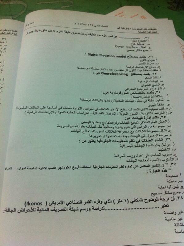 السلام عليكم أخوكم مجروح الزمن يسلم عليكم ويقول تفضلوا أسئلة مصورة لمادة نظم تطبيقات الجغرافيا الطبيعية الترم السابق لعام 35 - 36