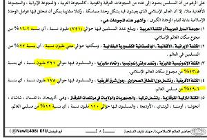 وأنا أتصفح ملزمة الأخ أبو فيصل لمادة حاضر العالم الإسلامي لفت إنتباهي بعض المعلومات عن نسب المسلمين في العالم حيث مذكور أن الكتلة العربية يبلغ عدد سكانها ( 741 ) مليون مسلم ، أي بنسبة 16.2 % من مجموع سكان العالم الإسلامي في حين الكتلة الإيرانية ، الأفغانية ، الباكستانية الكشميرية البنغالية سكانها فقط 200 مليون وتمثل 22% من سكان المسلمين ونفس الشي مع بقية النسب ؟؟؟؟؟؟؟؟؟؟؟؟؟ كيف تجي لا والأدهى والأمر أن لو نجمع النسب كلها ( 16.2% + 22% + 13.5% + 19.6% + 12% + 6.5 % ) = 89.8 يعنى باقي نسبة 10.2 وين راحت ولكم جزيل الشكر |