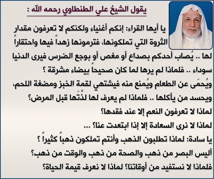 فالمال لا يشتري السعادة! بل احمد الله على ما لديك؛ فالقناعة كنز لا يفنى! السعادة بالصحة والأمان الذي تعيشه!» |