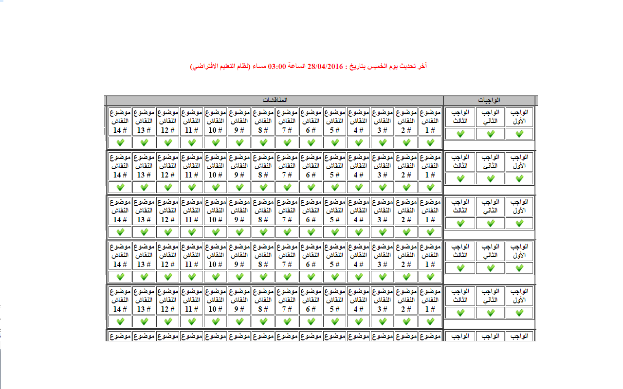 سلآم عليكم ورحمة الله وبركاته اسعد الله صباحكم / مساءكم بكل خير دعواتي لي ولكم بالتوفيق بالإختبارات والله ينجحنا هالترم ويسهل علينا كل شي صعب بالنسبه للخارطه الصراحه انا نظامي من سنتين أحل المناقشات والواجبات بالإفتراضي وأحمل المحاضرات المسجله والمباشره بالبلاك بورد الحين ادخل على الخارطه يقول آخر تحديث لها : (( للإفتراضي )) يوم الخميس تاريخ 28/4/2016 الساعه 3 مساء (( للبلاك بورد )) تاريخ يوم الثلاثاء - 12/04/2016 الساعه 11:00 صباحا اخر تحديث للواجبات يوم الأربعاء - 20/04/2016 الساعه 02:00 مساء اخر تحديث للمناقشات يوم الثلاثاء - 19/04/2016 الساعه 10:00 صباحا يعني على كاذا ان الإفتراضي هو اللي تحدث حتى تاريخ أمس يوم الخميس والبلاك بورد لسه ما تحدث الله يستر ما يوهقنا البلاك بورد ![]() الصوره اللي بالمرفق اللي يمين هاذا الافتراضي واللي يسار البلاك بورد |