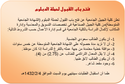 تعلن كلية الجبيل الجامعية عن فتح باب القبول لحملة الدبلوم من كلية الجبيل الصناعية في التخصصات: التسويق، المحاسبة، إدارة المكاتب، لإكمال الدراسة في تخصص إدارة الأعمال