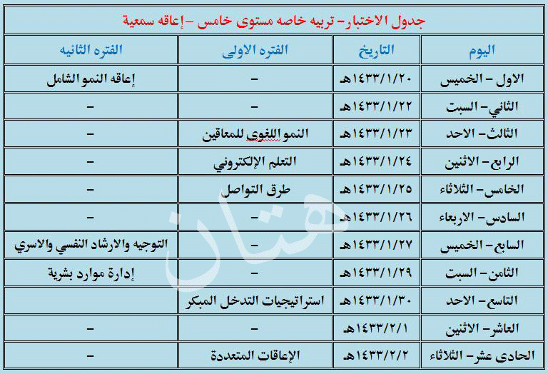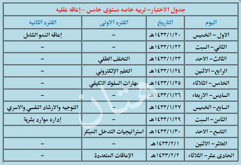 رد: جدول الاختبارات .. تربيه خاصه .. مستوى ثاني وثالث ورابع وخامس جميع التخصصات .. مرتبه لكل مستوى ..