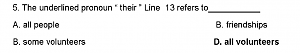 القطعه في المحاضرة التاسعه عن المتطوعين السؤال رقم 5 كلمة their تعود على مين ابي تشرح لي ليه اخترت all volunteers وليه مااخترت some volunteers مع ان في القطعه مكتوب بعضهم يزوزون بعضهم يعطون وبعضهم ..... وعندي طلب ممكن الله يوفقك تحصر لنا الكلمات اللي لا تقبل يجي قبلها اي من اداوات التعريف ... وتحصر لنا الكلمات اللي قبلها يجي the على طول ... لان مو كل الكلمات لها قاعده في كلمات شاذه وهالشيء يلخبطنا ![]() نبي نحفظها ![]() ولك جزيل الشكر ![]() |