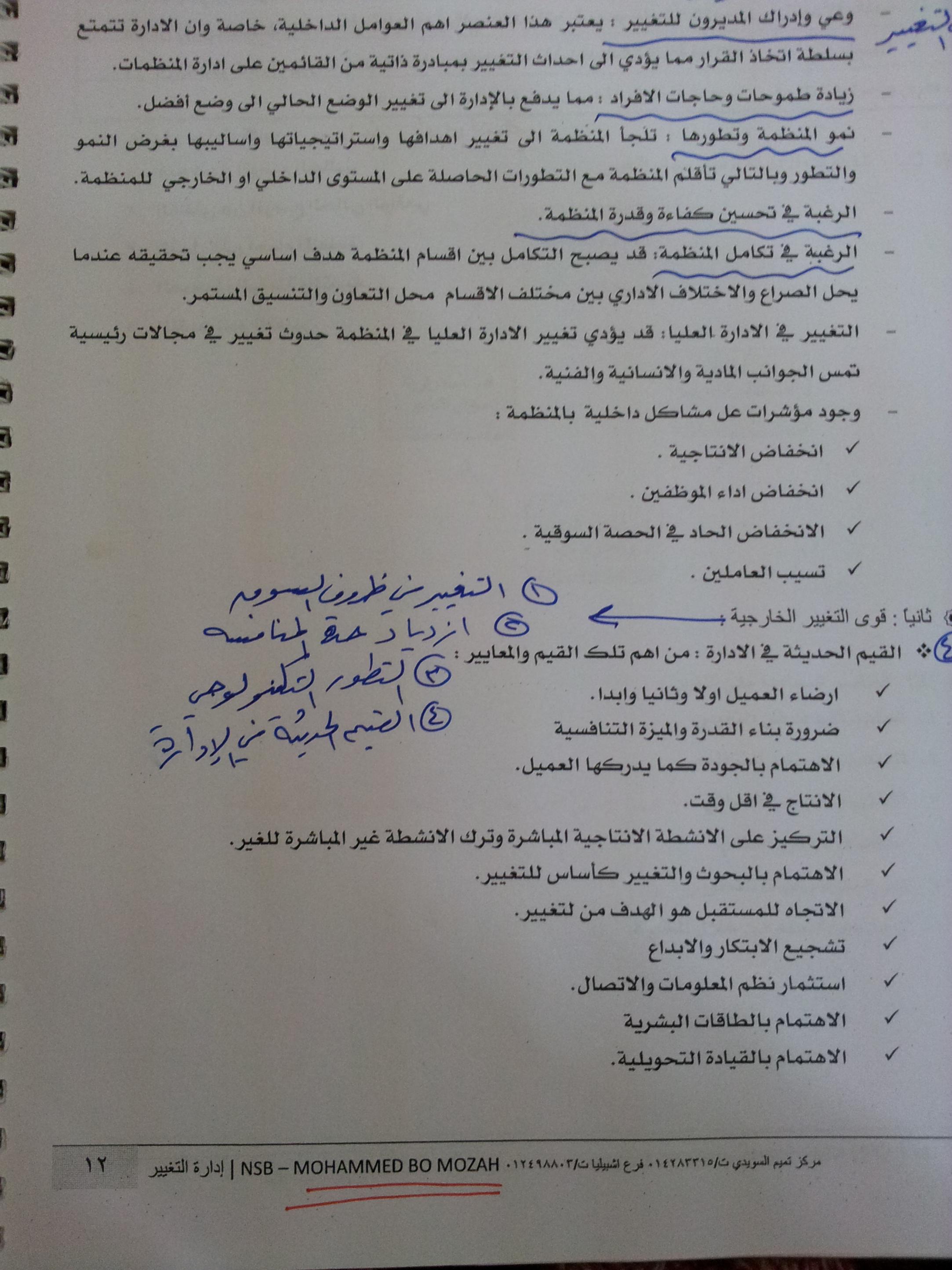 ![]() في البداية يشكر اخونا محمد بو موزة على الجهد المبذول والانسان معرض للنسيان وجزاه الله الف خير الملاحظة في المحاضره الخامسة تحديداً في قوى التغيير الخارجية / في الملخص ذكر العنصر الرابع فقط وهي اربع عناصر هي 1/ التغيير في ظروف السوق 2/ ازدياد حدة المنافسة 3/ التطور التكنولوجي 4/ القيم الحديثة في الإدارة << هذه هي المذكوره في الملخص فقط ارفقت لكم التعديل بصوره اوضح وعلى ذلك جرى التنويه