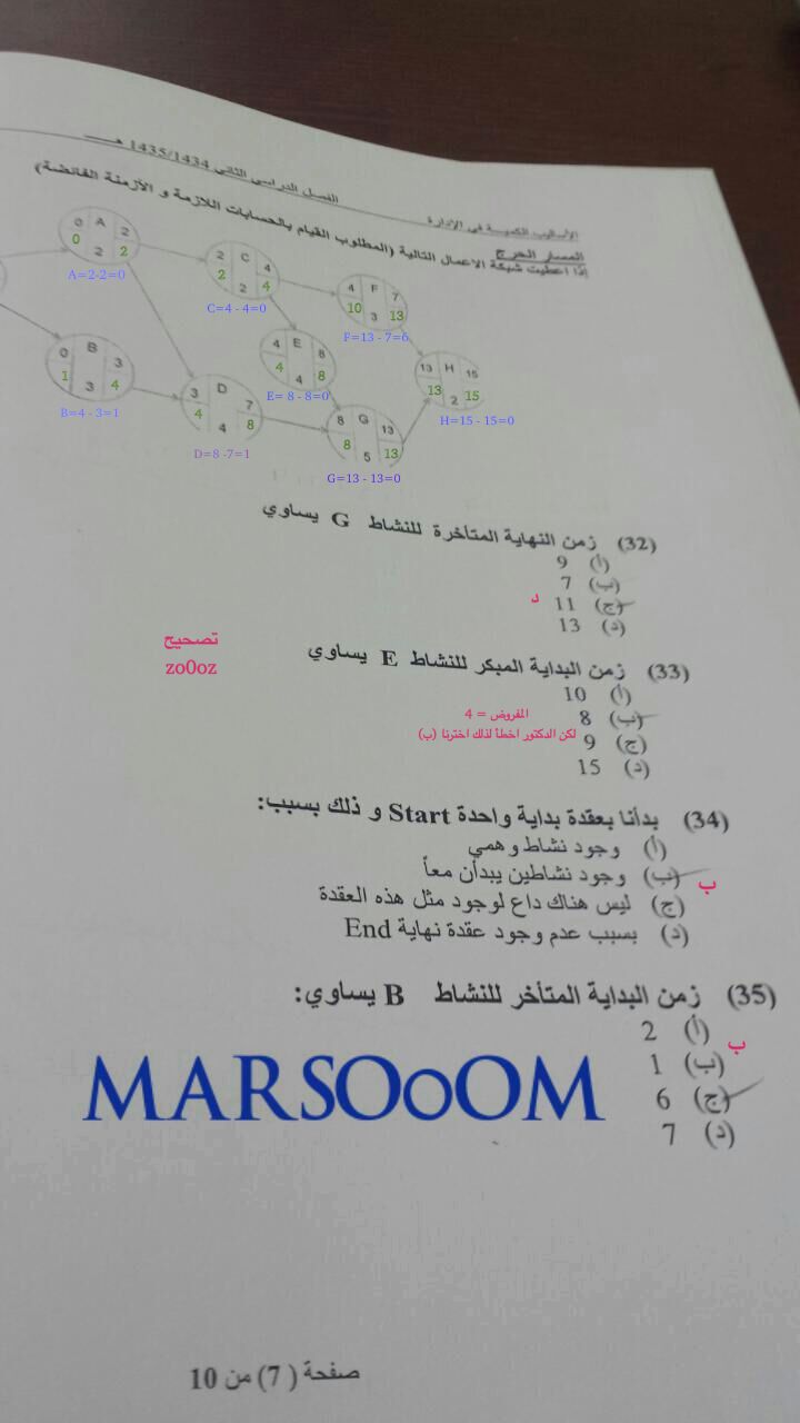 بالنسبة لسؤال الزمن الكلي للمشروع الإجابة هي 15 مافي أي غلط بالسؤال لان تحسبين أزمنة الأنشطة اللي فائضها صفر يعني الأعداد داخل الشبكه الدكتور كاتبها مو الفائض اللي إحنا طلعناه وبالنسبة لأسئلة المدخل التفاؤلي والتشاؤم والندم كلها غلط عندك المتفائل عقارات التشاؤم سندات الندم أسهم والسؤال 7 الإجابة د |