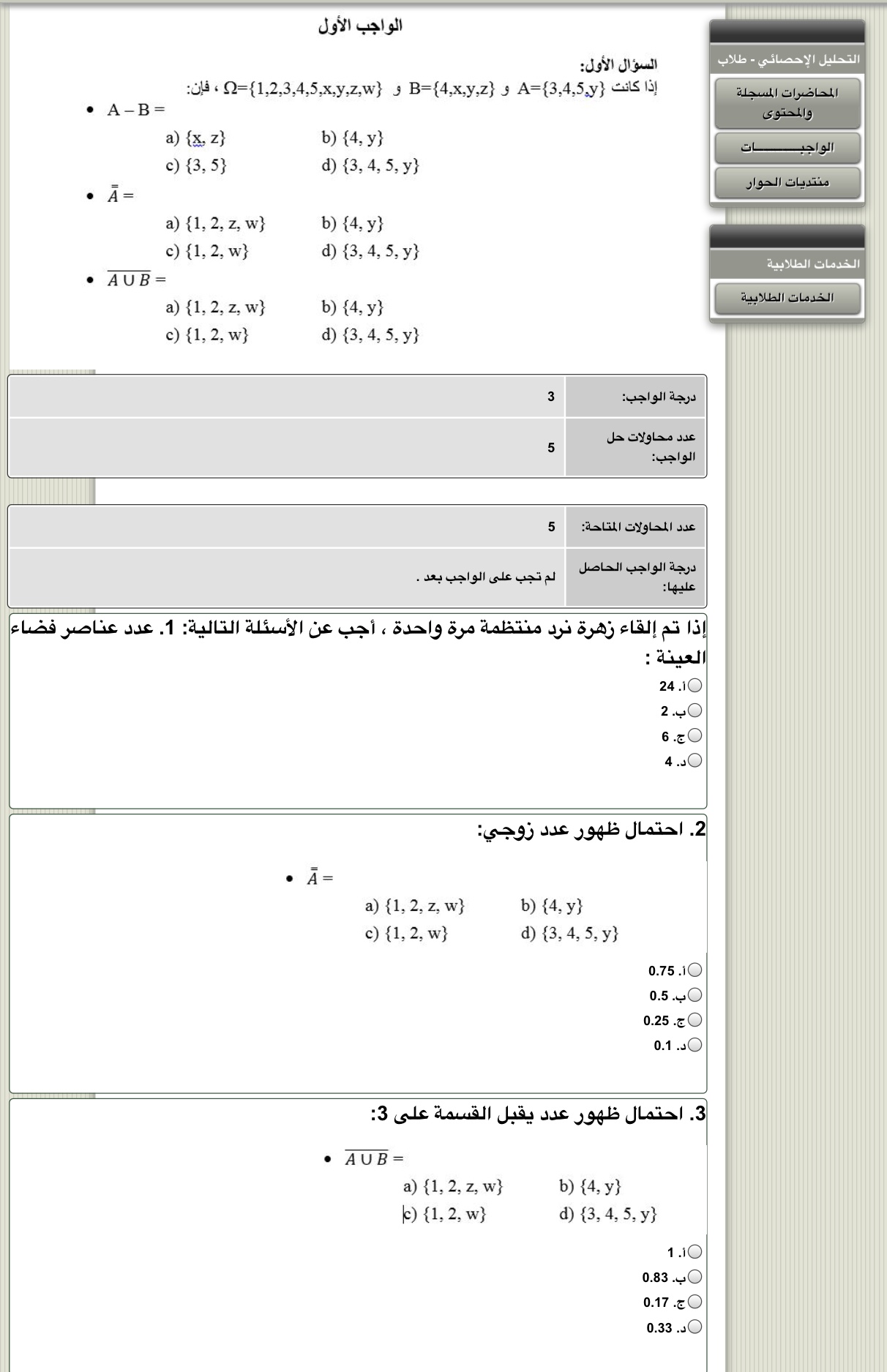 أمين وياك حل الواجب الاول التحليل الاحصائي الافتراضي ![]() ![]() ![]() ![]() ![]() تفضل / إذا تم إلقاء زهرة نرد منتظمة مرة واحدة ، أجب عن الأسئلة التالية: 1. عدد عناصر فضاء العينة : الجواب / 1/ ج-6 2.احتمال ظهور عدد زوجي: الجواب2 / د- 0.1 3.احتمال ظهور عدد يقبل القسمة على 3: الجواب / د. 0.33 ![]() ![]() ![]() ![]() (لاتنسوني من دعاكم)
